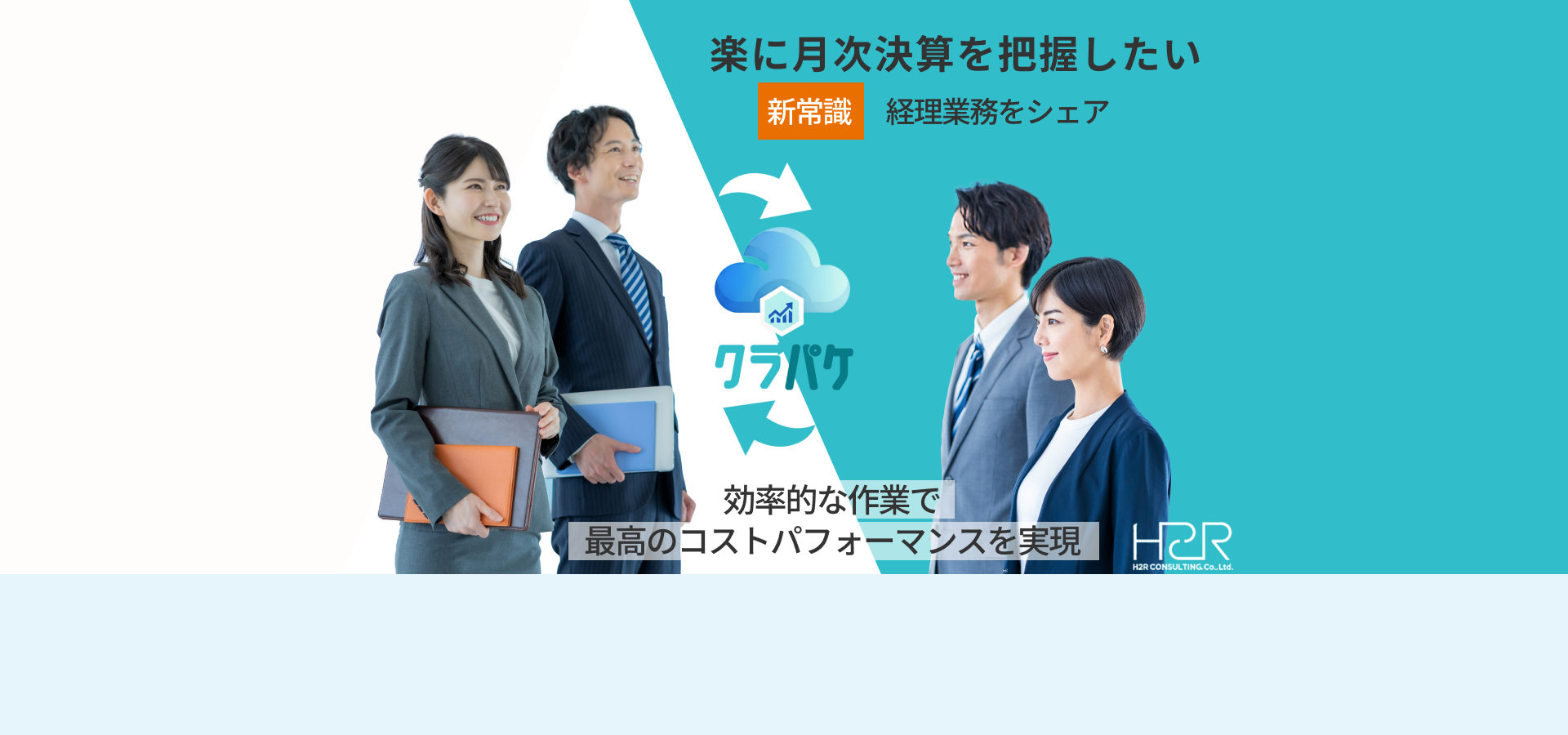社内で経理担当を採用・育成する場合には、採用費・人件費・教育・引き継ぎリスクなど大きなコストが発生しますが、クラパケでは 必要なデータ整理は企業様、月次決算作成はH2Rコンサルティングが担当する共同型のため、